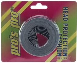 10 strips of Pro’s Pro Head Protection Fashion Tape measuring 17.5″ in length and .62″ in width. 2 strips are needed for one racquet. Unlike other head tapes, these do not need to be removed for restringing. The tape is black with ‘Pro’s Pro’ printed throughout.