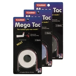 Tourna Mega Tac overgrip is so tacky it grabs you back. It features an exclusive tacky PU coating that clings to your hands and prevents twisting and sliding. It is long lasting and is offered in an extra-long length for longer handles. 3 per pack.